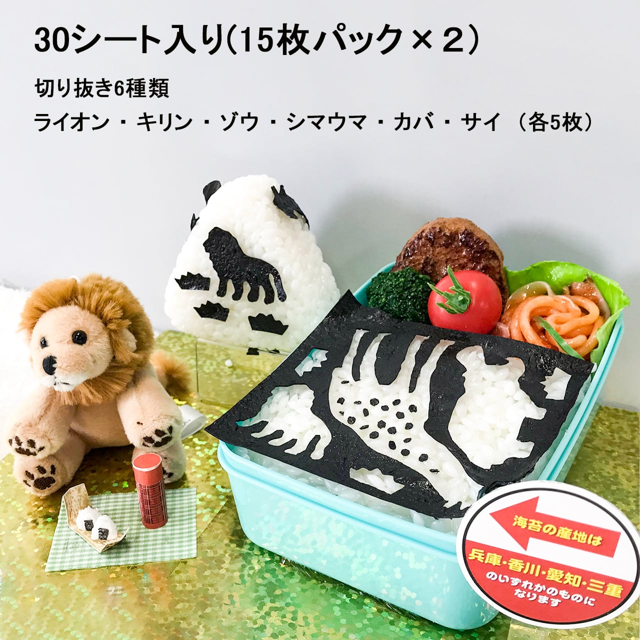 どうぶつの形をした焼きのりは、品質の良い国産海苔を使用し、お弁当のごはんにのせたり、おむすびに巻いたりするだけで、かわいいサファリランチの出来上がり!!